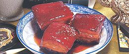 - Heat 1 Tbsp oil, saute ginger and spring onion, add wine and cook until fragrant, add light soya sauce and rock sugar and cook until dissolves, pour over pork pieces, cover and double-boil for 2 hr until tender.
