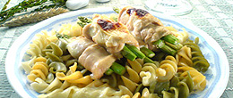 鮮蘆筍雞卷配焗三色意粉