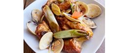 - 加入蜆在雞件上,蓋上蓋子,以中火煮3至5分鐘直至蜆殼打開,扔走未開口的蜆,加入李錦記純石磨芝麻油及李錦記白胡椒粉,試味後,以蔥花裝飾,即成